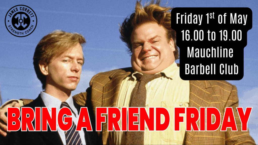 Consider this a personal invitation to bring a friend to Bring a Friend Friday at 16.00 to 19.00 on Friday 1st of May at Mauchline Barbell Club, Google Maps Link Here.